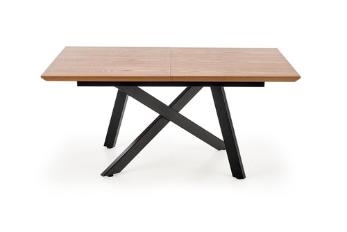 stół rozkładany, wymiary: 160-200/90/76 cm, materiał: MDF okleinowany / stal malowana proszkowo, kolor: blat - dąb złoty, nogi - czarny UWAGA: po wylaniu jakichkolwiek płynów na blat stołu należy niezwłocznie wytrzeć go do sucha w celu uniknięcia wchłonięcia wody przez materiał blatu.